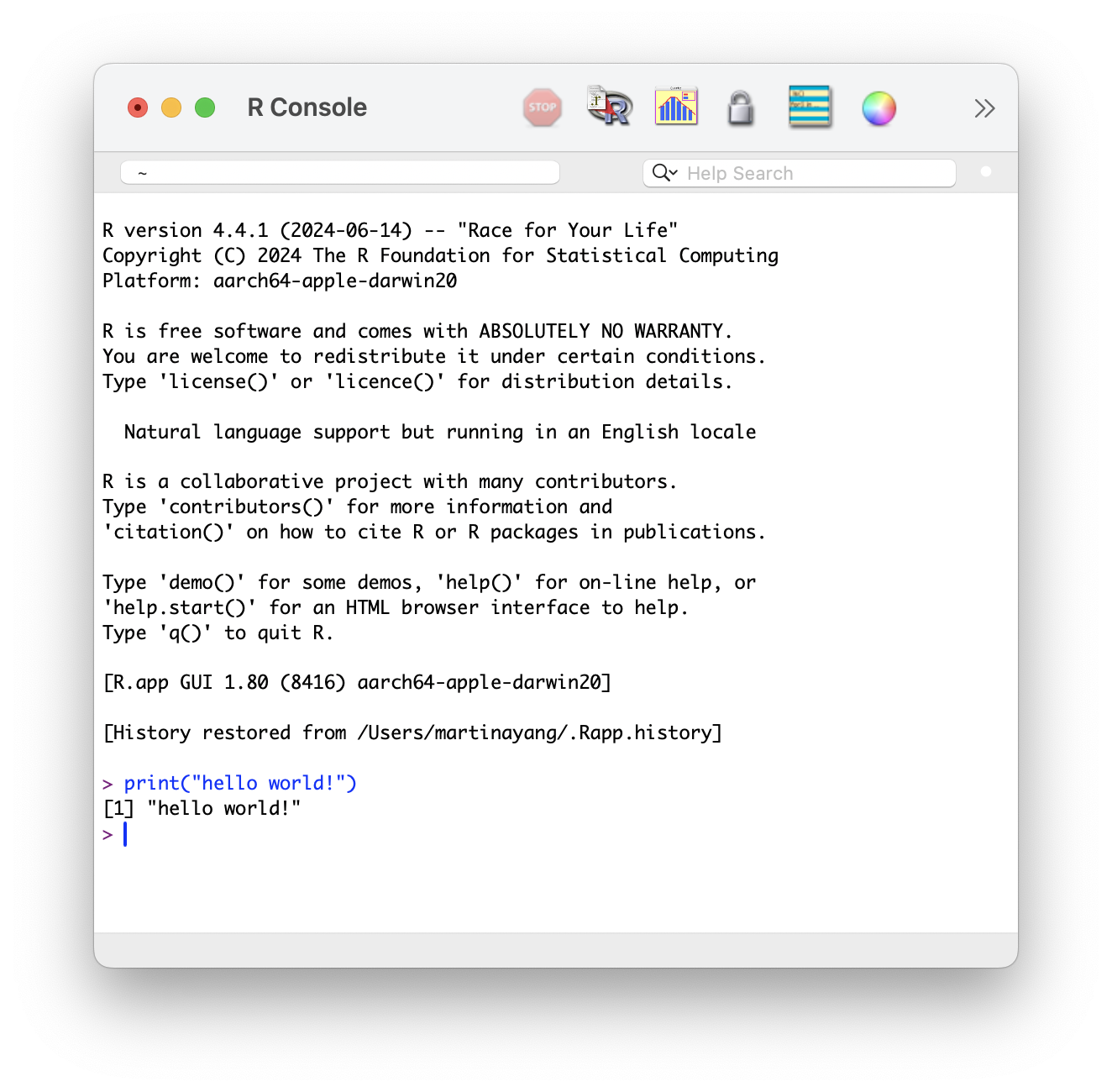 1. Finding Your Working Directory: Right next to your R version, you will see a file path starting with ~/. This is your Working Directory—the specific folder on your computer where R is currently “looking” for files.