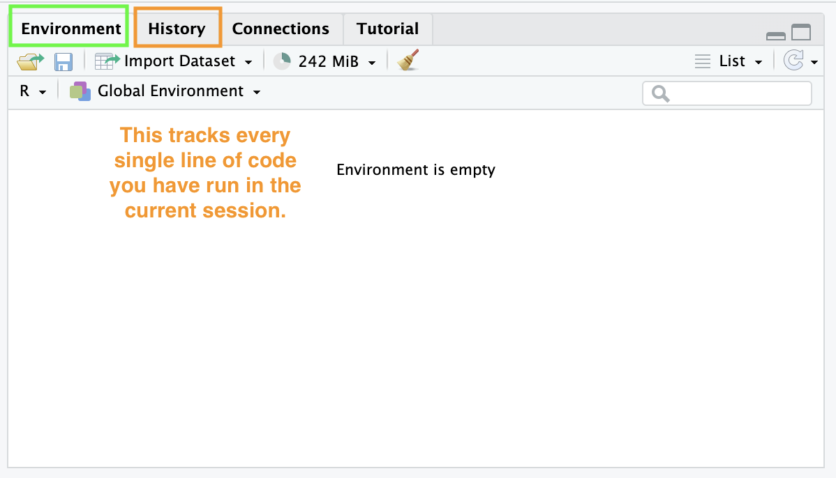 • History: This tracks every single line of code you have run in the current session. If you forgot to save a line of code to your script, you can find it here.