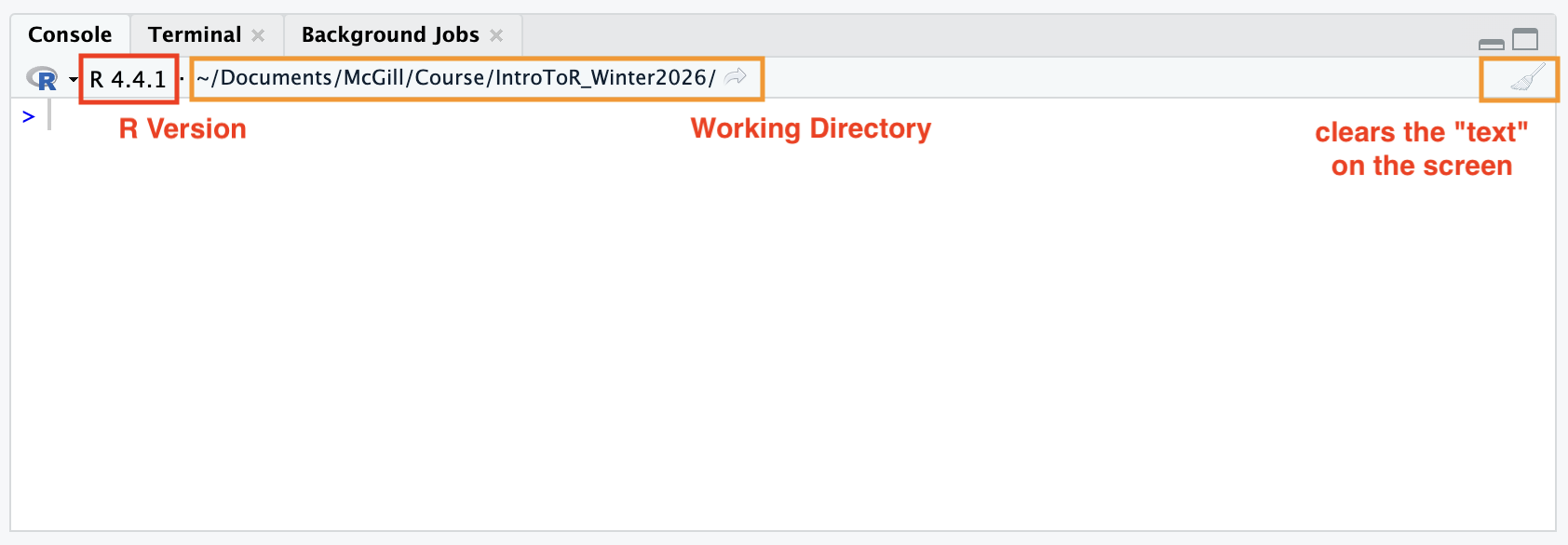 getwd()in the console. R will return the full “GPS address” (path) of your current location.Using Your Eyes: Look at the top of your Console panel. Right next to your R version info, you will see a file path (often starting with