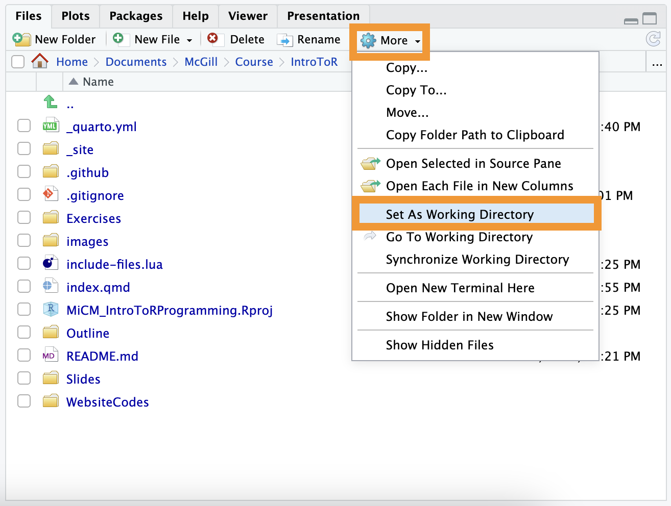 In the Files pane (bottom-right), navigate to the folder you want. Click the “More” gear icon and select “Set As Working Directory.”