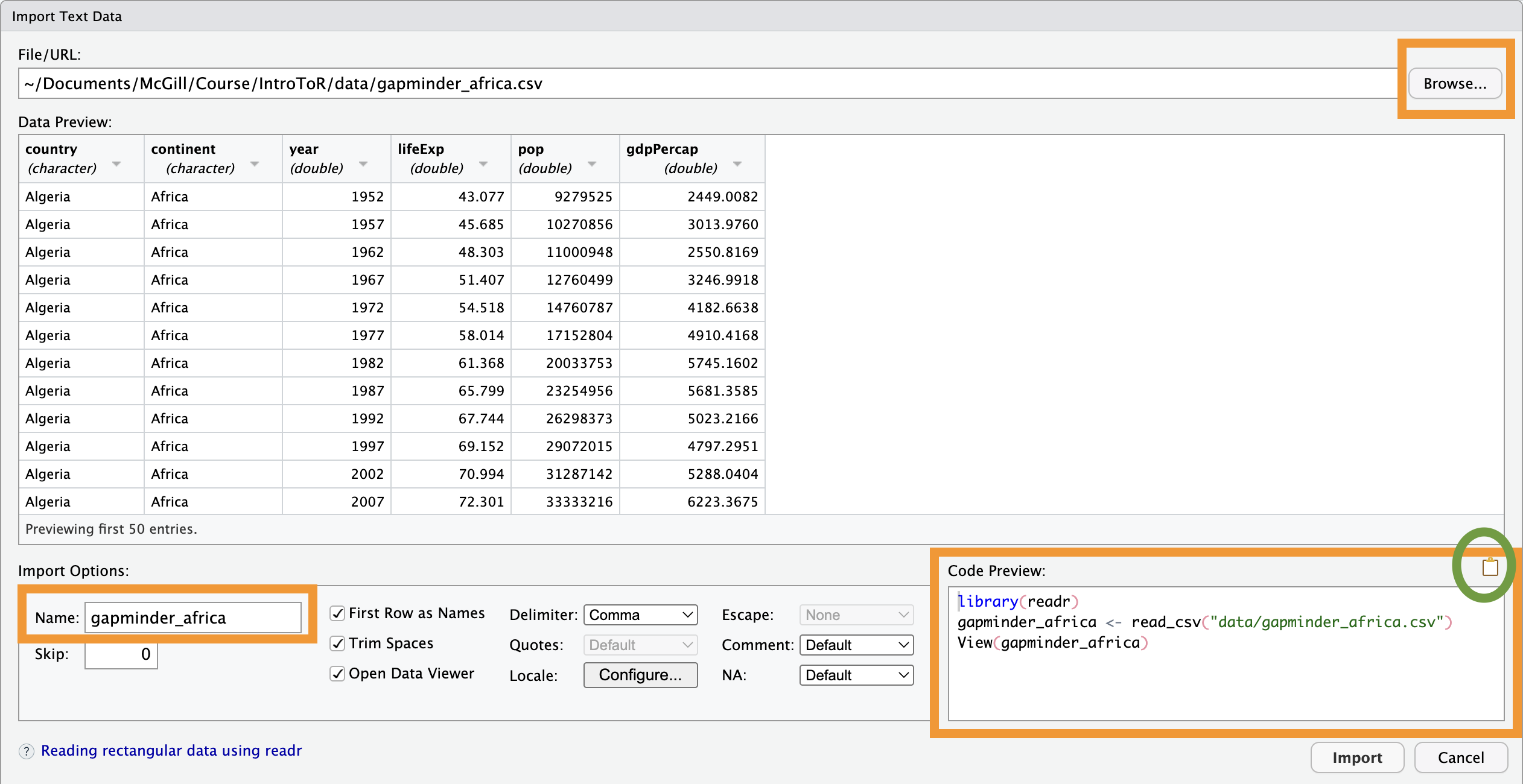 Look at the “Code Preview” box in the bottom-right of the window. RStudio writes the code for you! You should copy and paste that code into your script so that your work is reproducible next time.