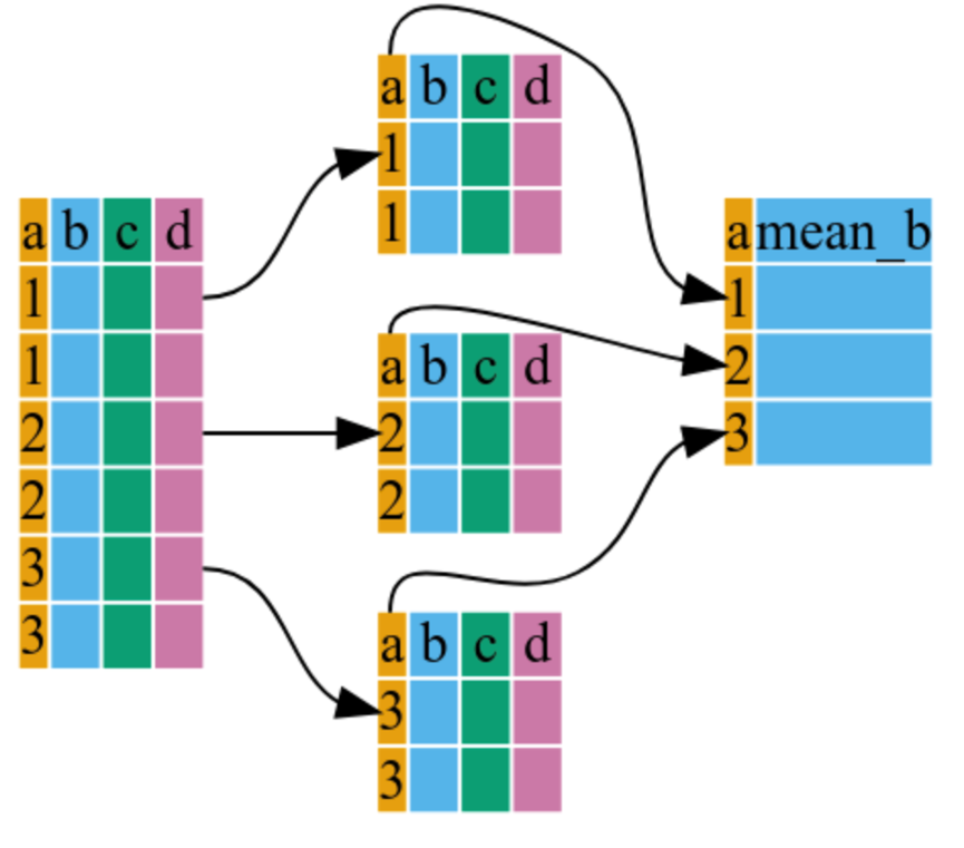 This is the most common workflow in bioinformatics. You split the data into groups, apply a calculation, and combine the results into a summary table.