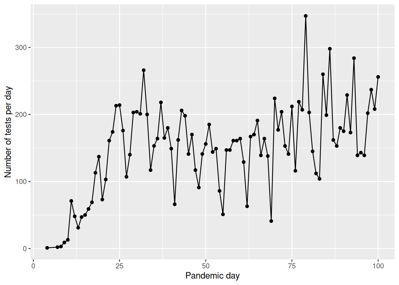 result != "invalid": Removes tests that didn’t work (QC failure).&: A logical “AND.” Both conditions must be true.pan_day <= 100: Only includes data from the first 100 days of the pandemic.